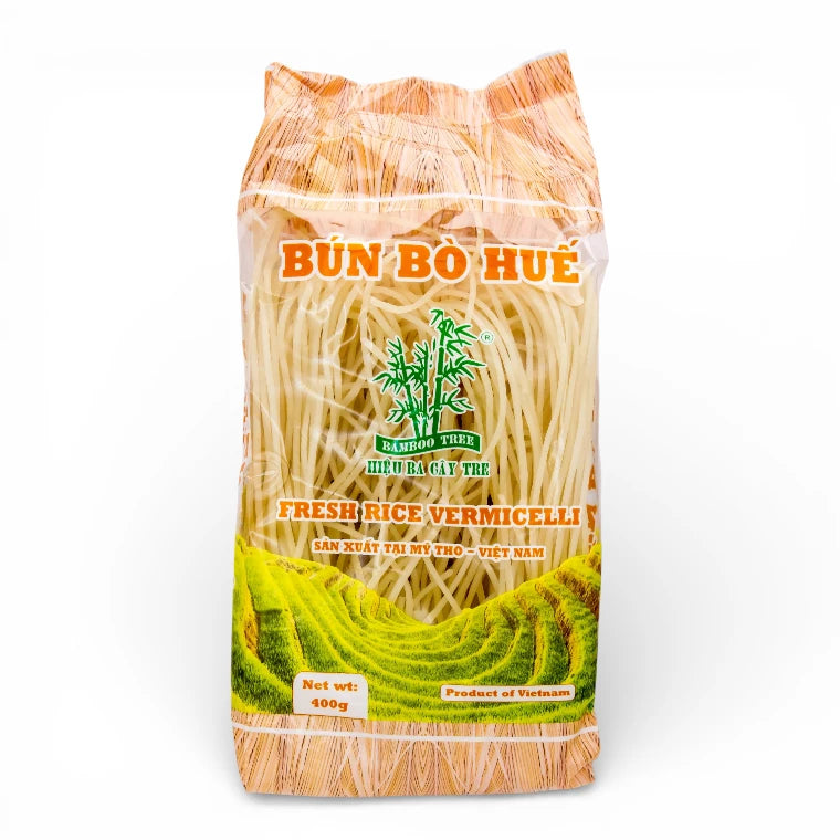 Torkade risnudlar från Bamboo Tree, särskilt framtagna för den klassiska vietnamesiska rätten Bún Bò Huế. Nudlarna har en fyllig och lätt seg konsistens som passar perfekt i mustiga soppor och buljongbaserade rätter. Trots benämningen "fresh" är de torkade och enkla att tillaga. Ett utmärkt val för autentisk vietnamesisk matlagning hemma.