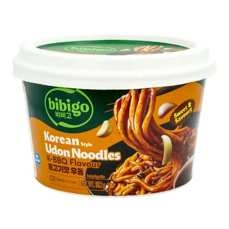 Bibigo Korean Style Udon Noodles med K-BBQ-smak erbjuder en fyllig och smakrik upplevelse inspirerad av koreansk barbecue. De tjocka udon-nudlarna kombineras med en smakrik sås som ger sötma, sälta och rökighet – precis som traditionell bulgogi. Färdiga på bara 2 minuter i mikron (700W), perfekt för en snabb och god måltid.