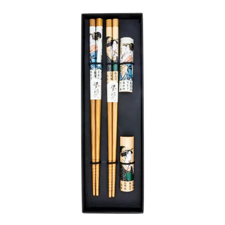 Bjud in till en stilfull middag med detta ätpinneset för två personer, inspirerat av traditionell japansk geishaskönhet. Setet innehåller två par ätpinnar och två matchande vilostöd – både praktiskt och dekorativt. En underbar present eller en fin detalj för ditt eget dukade bord! (Handdisk rekommenderas)