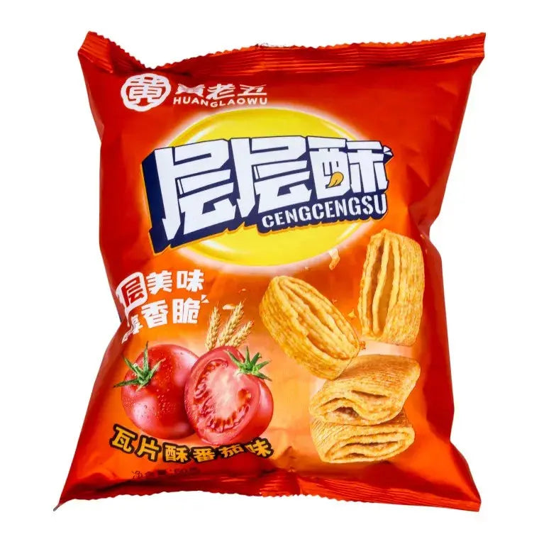 Upptäck en ny typ av snacks med dessa vetekex från Huang Lao Wu! Med flera lager och krispig textur kombineras de med en fyllig tomatsmak som passar både som mellanmål och tillbehör till sallader eller soppor. Ett smakrikt och krispigt alternativ till chips, perfekt när du vill prova något nytt från det asiatiska köket.