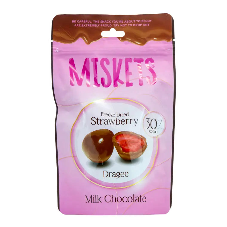 MISKETS chokladdragé är en perfekt kombination av naturligt söt frystorkad jordgubbe och len mjölkchoklad med 30% kakao. Ett lyxigt snack för dig som älskar frukt och choklad i ett – krispig kärna, krämigt skal. Perfekt som godis, gåva eller något extra gott till kaffet!